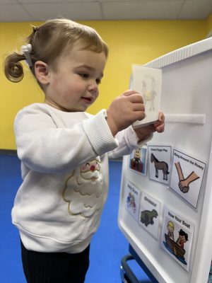 The Toddler class focuses on turn-taking, sharing, group instruction, and basic direction following. These goals are accomplished through music, movement, parachute activities, puppets, bubbles, and so much more! A thematic picture schedule is used to guide the children through this highly structured class. Children of any ability can be successful in StoryPlay!